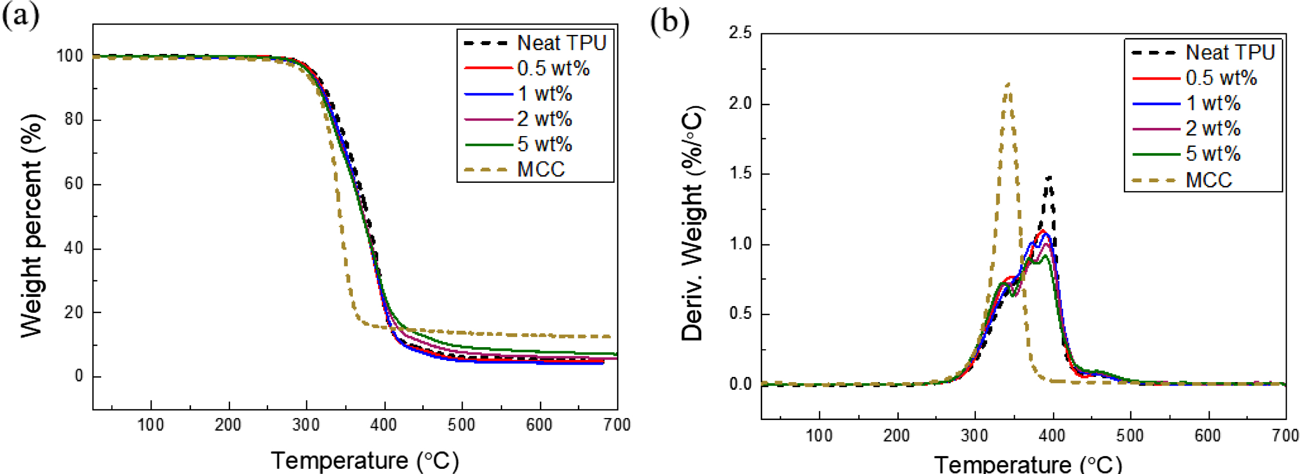 TGA thermograms of neat TPU, TPU-MCC composites, and MCC: (a) weight decrease curves; (b) DTG curves.