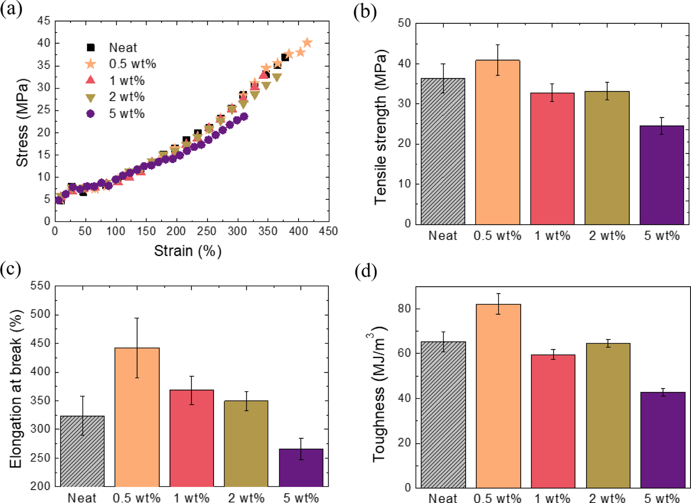 Mechanical testing results measured by UTM in tension: (a) representative stress - strain curves for TPU composites with different MCC contents; (b) average tensile strength and standard deviation of TPU-MCC composites; (c) average elongation at break and standard deviation of TPU-MCC composites; (d) average toughness and standard deviation of TPU-MCC composites.