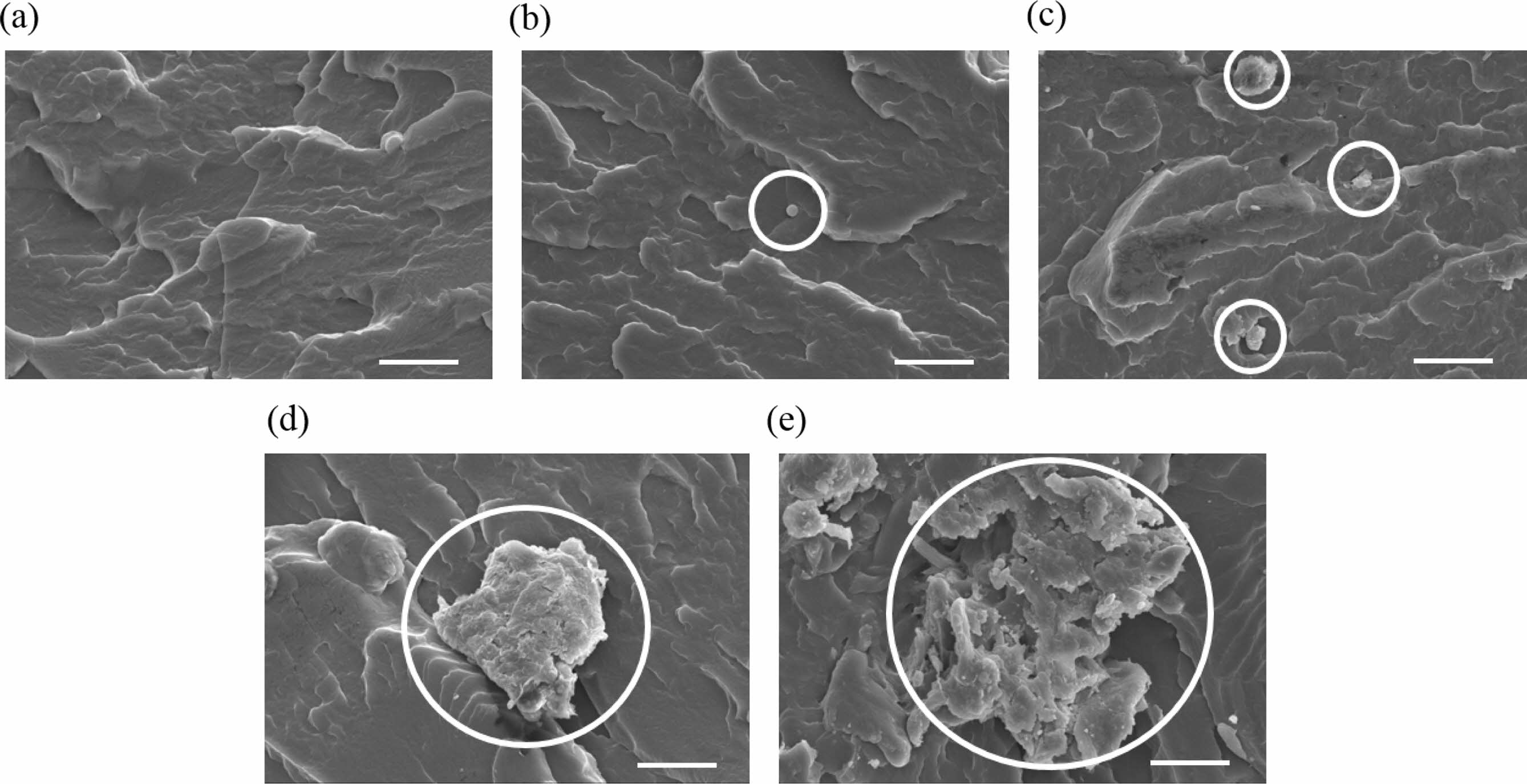 SEM micrographs of fracture surface of TPU composites with different MCC contents: (a) neat TPU; (b) 0.5 wt% MCC; (c) 1 wt% MCC; (d) 2 wt% MCC; (e) 5 wt% MCC. Scale bars of figures denote 20 μm.