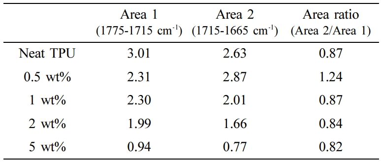 TPU에 MCC가 첨가되면 카보닐기에 수소결합이 도입되고 전자밀도가 카보닐기(π-전자 수용체)에서 수산기(π-전자 공여체)로 전달된다. 이에 따라 카보닐기의 결합 길이가 길어지고 결합 세기가 약해지며 더 낮은 wavenumber로 피크가 이동하게 된다. Area ratio 값이 클수록 각 물질 내에서 수소 결합에 참여하는 카보닐기의 비율이 높음을 확인할 수 있다. Table 1을 보면, neat TPU와 비교하여 MCC의 함량이 0.5, 1, 2, 5 wt%로 증가할수록 Area 1은 각각 3.012, 2.312, 2.302, 1.990, 및 0.941로 감소했으며, Area 2는 각각 2.631, 2.865, 2.012, 1.663, 및 0.770로 0.5 wt% 복합체에서 neat TPU 대비 증가했다가 1 wt% 복합체부터는 감소하는 경향을 나타냈다. 위 값들에 대해 식 (1)을 이용해 계산한 area ratio는 neat TPU와 0.5, 1, 2, 5 wt% 복합체에서 각각 0.874, 1.239, 0.874, 0.836, 0.818로 0.5 wt% 복합체에서 neat TPU 대비 41.8% 증가했다가 1 wt% 복합체부터는 감소하는 경향을 나타냈다. TPU 매트릭스에 MCC 보강재가 첨가되며 TPU와 MCC 간에 수소결합이 발생하는데, 0.5 wt% 복합체에서는 수소결합에 참여하는 카보닐기의 비율이 뚜렷하게 증가했으나, 1 wt% 복합체부터는 반대로 수소결합에 참여하는 카보닐기의 비율이 감소하는 경향을 나타냈다. 이는 0.5 wt%에서 MCC 보강재가 TPU 매트릭스 내에 가장 효과적으로 분배 및 분산되어 있을 것이고, 1 wt% 부터는 오히려 MCC 보강재 간의 응집이 발생하여 TPU 매트릭스와 상호작용할 수 있는 보강재의 비율이 감소하였고 이를 통해 수소결합이 감소된 것으로 판단된다.