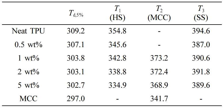 열중량 분석법(Thermogravimetric Analysis). TGA 분석 및 TGA 곡선의 1차 미분 값인 미분 열중량분석(derivative thermogravimetry, DTG)을 통해 복합체의 열안정성을 분석한 결과를 Figure 5에 도시했다. Neat TPU의 초기 5% 분해되는 온도는 309 °C였으며 DTG 피크에서 TPU를 구성하는 경질 세그먼트 분해온도인 T1은 355 °C, 연질 세그먼트 분해 온도인 T3는 395 °C에서 최대 분해 속도를 가짐을 확인했다. MCC의 초기 5%가 분해되는 온도는 297 °C이며 MCC 함량이 증가할수록 복합체의 열안정성은 점차 감소함을 확인했다. Table 2에 나타낸 TGA 데이터를 보면 초기 5% 분해 온도는 MCC 함량이 증가할수록 낮아지는 경향을 나타냈으며 이는 MCC의 낮은 열안정성이 기인한 것으로 판단된다. 또한 DTG 데이터 분석 결과, neat TPU에는 경질 세그먼트와 연질 세그먼트가 기인하는 T1, T3의 두 개의 피크가 나타나지만, 1 wt% 이상의 데이터에서 MCC로 인한 T2 피크가 나타나며 분해온도는 MCC 함량이 높아질수록 낮아지는 경향을 나타냈다.20