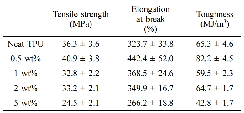 Figure 6(d) 그래프에 나타낸 응력-변화율 곡선의 면적인 인성(toughness)을 계산함으로써 복합체가 파괴되기 전까지 견딜 수 있는 에너지를 측정했다. 인성 측정의 결과를 보면 인장강도 및 연신율 변화의 경향과 유사하게 0.5 wt%에서 가장 높은 값이 나타나며 1 wt% 이상부터 감소하는 경향을 나타낸다. 증가폭이 가장 큰 0.5 wt% 데이터에서는 neat TPU 대비 25.9%가 증가했으며 가장 감소폭이 큰 5 wt% 데이터에서는 neat TPU 대비 34.4%가 감소했다. 즉, TPU-MCC 복합체를 통해 TPU 매트릭스보다 더 높은 인장강도, 연신율, 인성을 가짐을 확인할 수 있다.