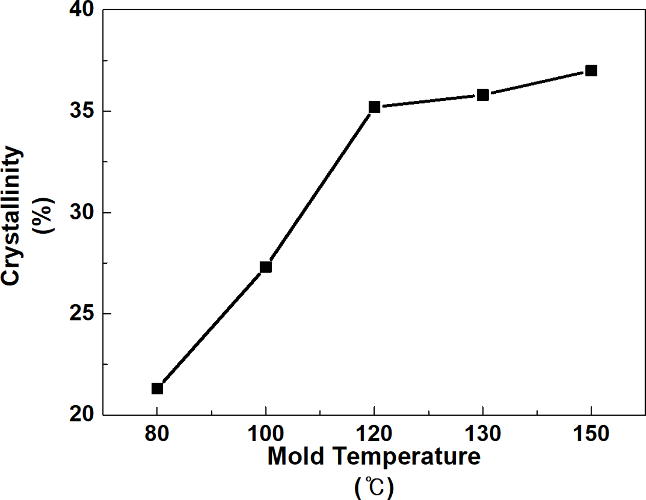 금형 온도는 소재의 결정화율을 조절할 수 있는 가공조건 중 하나로, 소재의 결정화율 조절과 그에 따른 물성변화 분석을 위하여 사출공정에서 금형