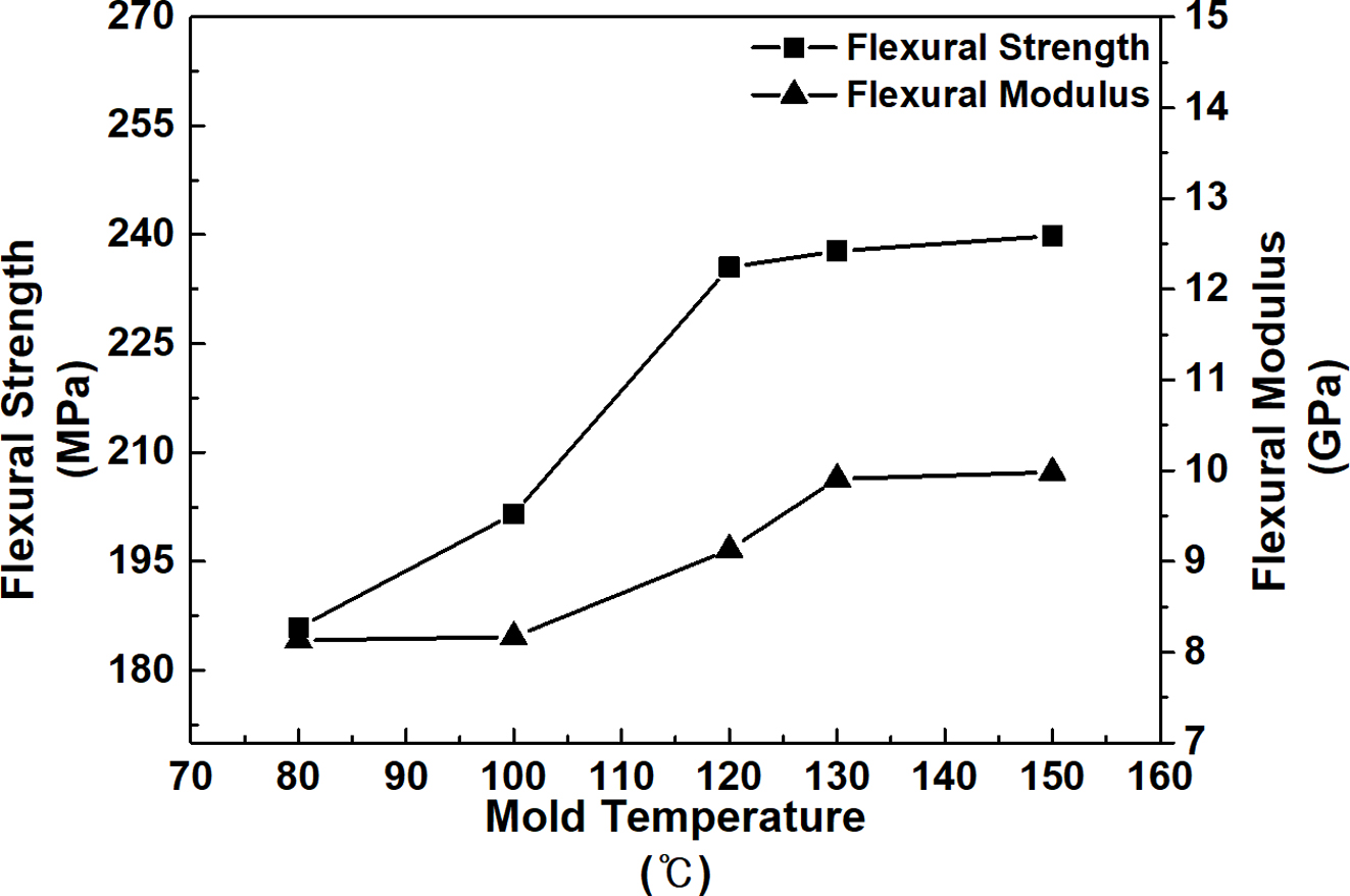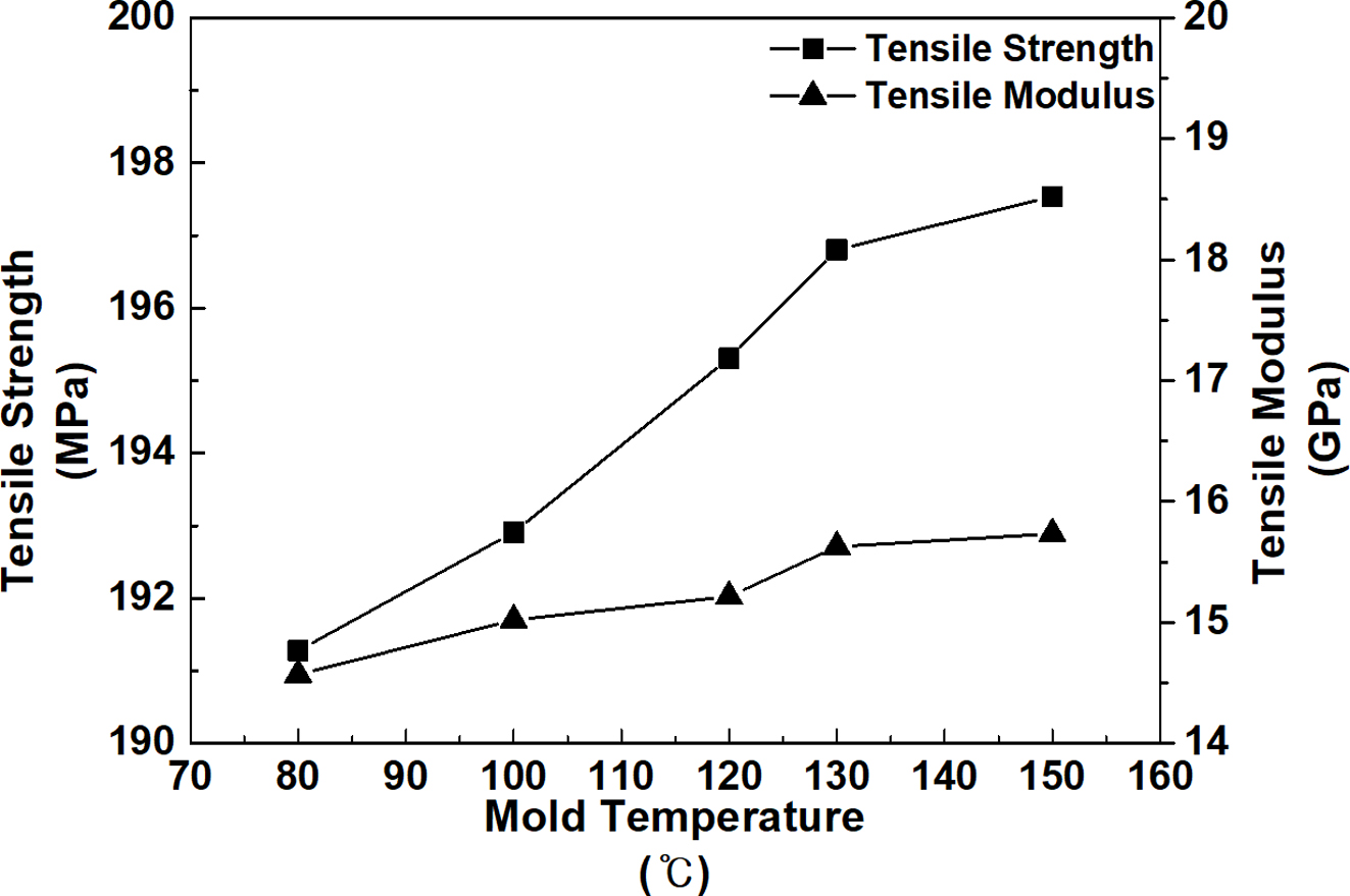 것이 확인되었다. Figure 3에서 보는 바와 같이, 인장 강도의 경우 금형온도 80 oC(191.3 MPa) 대비 150 oC에서는 197.5 MPa로 약 3.2% 향상되었으며, 모듈러스의 경우 14.6 GPa에서 15.7 GPa로 약 7.9% 향상된 경향을 보였다.