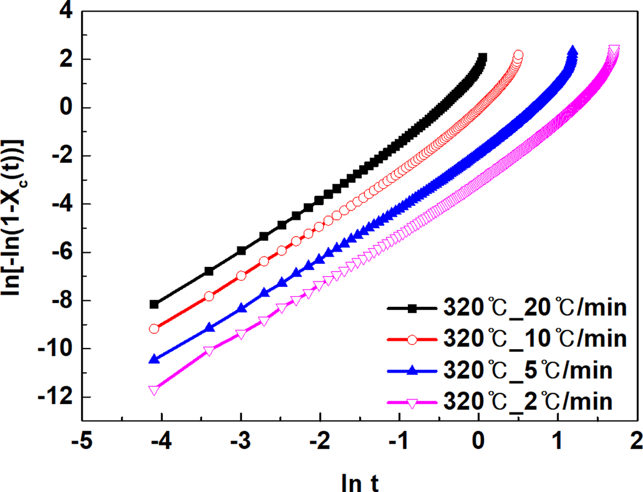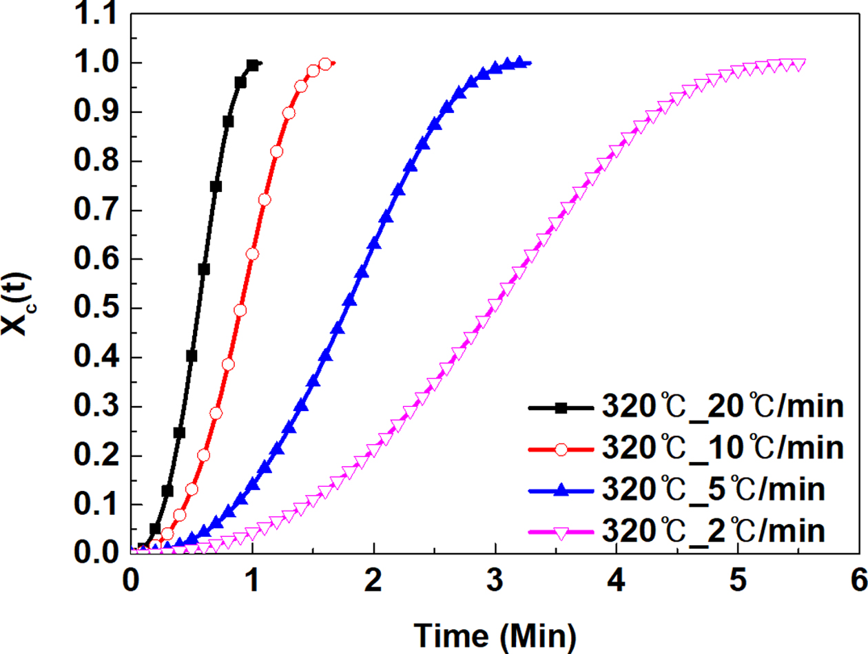 빠르게 진행됨을 확인할 수 있었다. 그리고 Figure 6의 결과에서 선형 회귀 분석을 통하여 결정성장속도상수(k)와 Avrami 지수 n을 분석하였다.