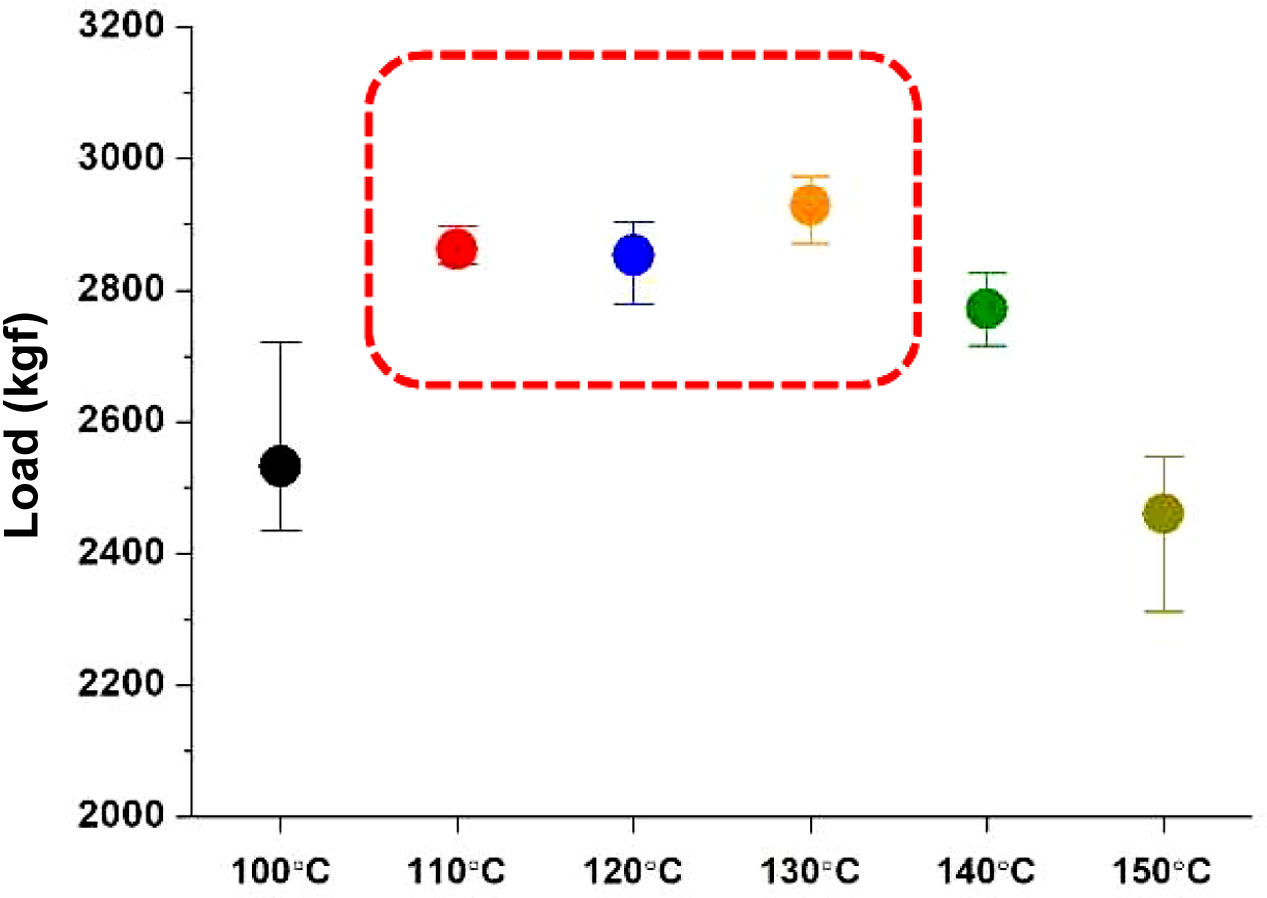 가장 낮은 값을 보인 150 oC 조건의 2461 kgf 보다도 약 20% 이상 향상된 물성값을 보였다.
