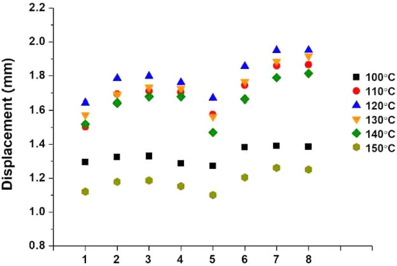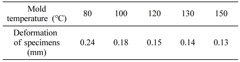 변위값을 보였으며, 최대 변위값을 보인 120 oC 금형온도 조건에서 성형한 부품의 경우는 1.643-1.951 mm의 변위값을 보였다. 최소 변위값은 150 oC 금형조건에서 1.101-1.261 mm의 변위를 보여주었다(Figure 8, 9).
