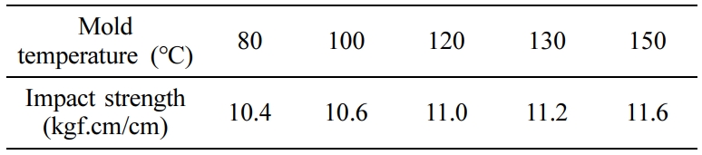 보는 바와 같이, 결정성 수지의 아이조드 충격강도의 경우에는 금형온도에 따라 값이 상승하는 경향은 일치하나 그 차이는 상대적으로 크지 않은 값을