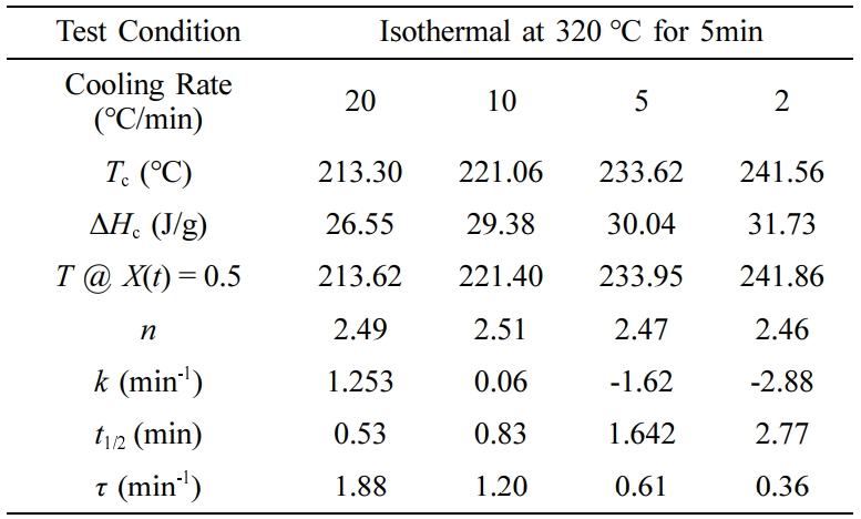 통하여 수지가 결정화되는 형태를 예측할 수 있다. Avrami equation을 적용한 시험결과를 Table 3에 정리하였다. 결정성장 속도상수의