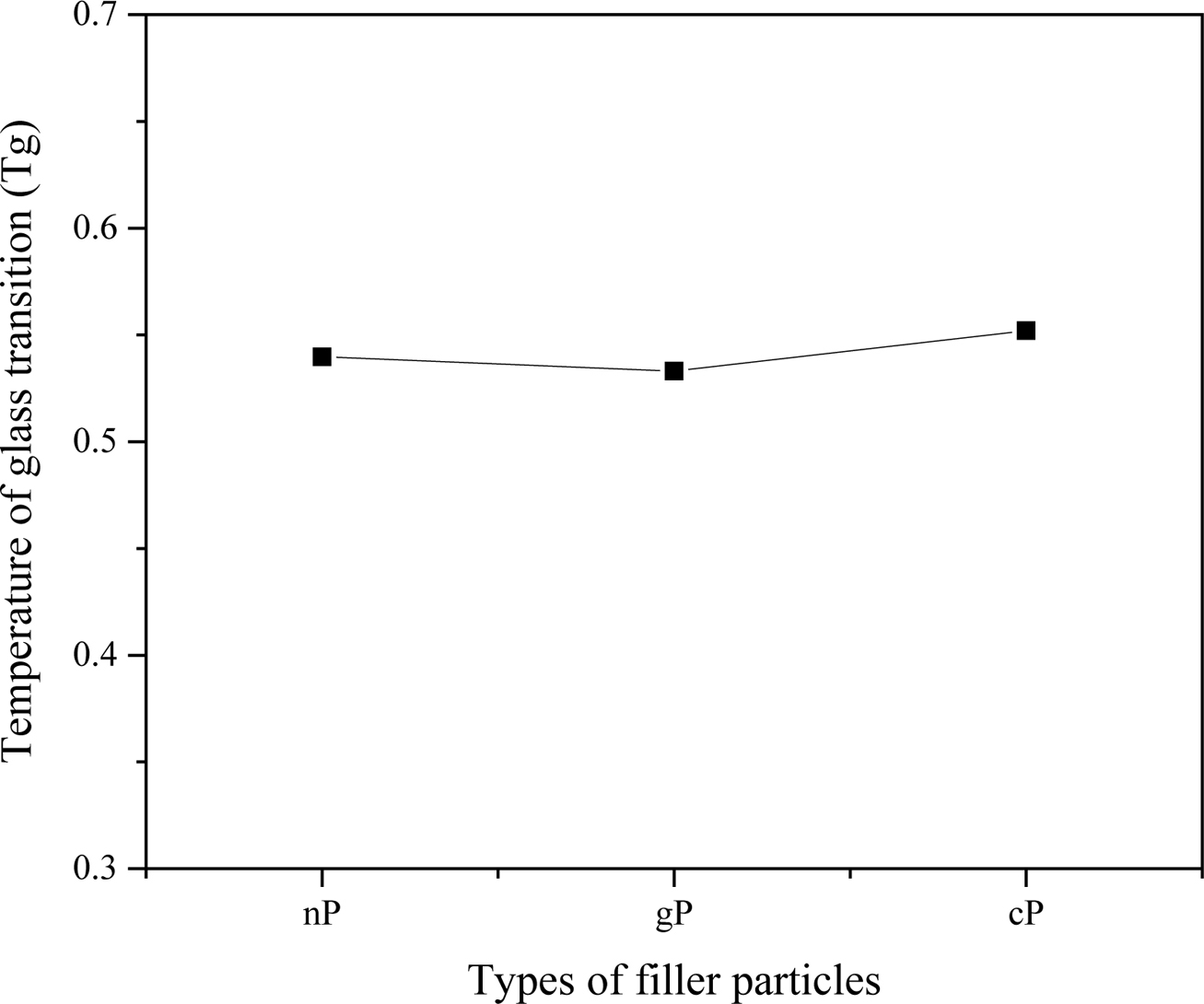 Figure 1 Temperature of glass transition (Tg) of polymer composites filled with different types of filler particles (nP, gP and cP,