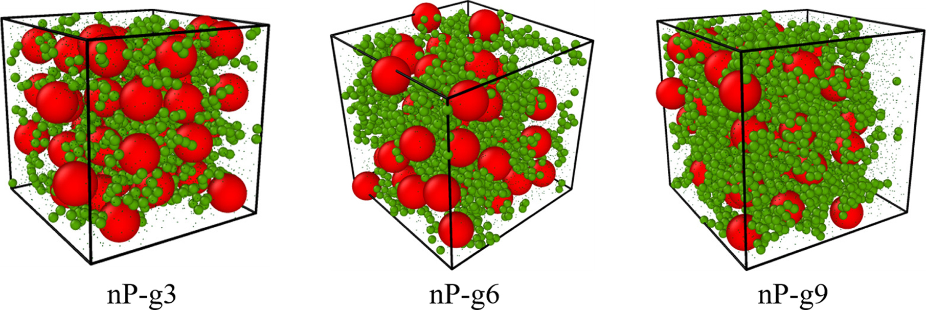 Figure 8 Snapshots of polymer composites filled with grafting chains with lengths to be 3 beads (nP-g3), 6 beads (nP-g6) and 9 beads (nPg9), respectively. |