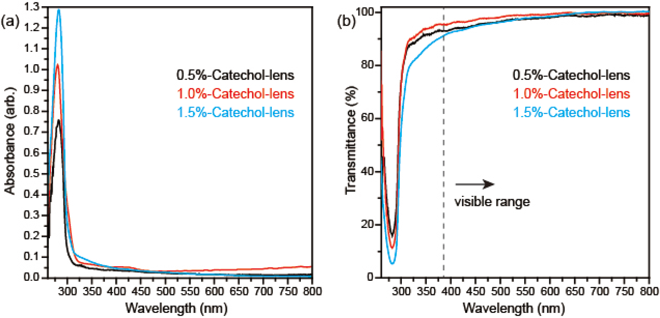 전, catechol-lens의 흡수 및 투과도를 UV-vis spectroscopy를 이용하여 조사하였다. 측정은 렌즈를 평면형태(렌즈두께:
