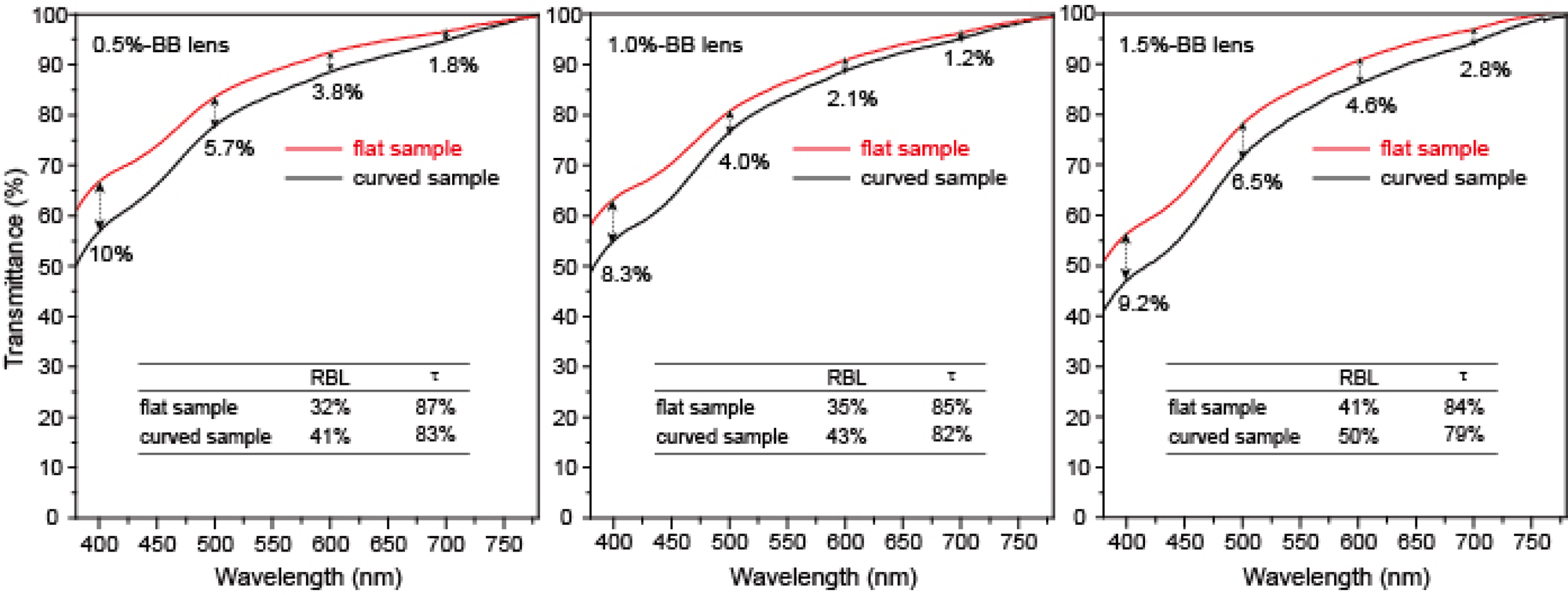 따른 구면수차 및 색수차 발생 여부를 살펴보기 위해, 렌즈를 평면 및 곡면 형태로 준비하여(렌즈 두께: 0.32 mm), transmittance 실험을 수행하였다. 평면 시료와 곡면 시료의 RBL 및 시감 투과율을 각각