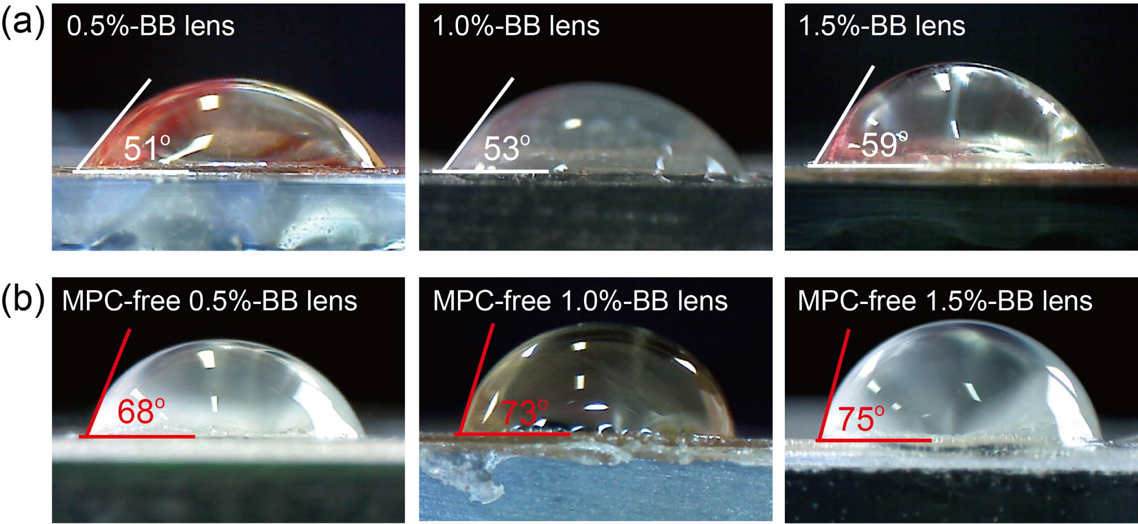 나타내어 렌즈 표면에서의 친수성이 우수하다는 것을 확인할 수 있었다. 이 같은 친수성 특성은 렌즈 제조 시 첨가한 쌍이온 MPC의 역할 때문이다.