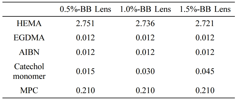 청색광 차단 콘택트렌즈 제조. 중합에 사용할 시료 혼합은 Table 1에 나타내었다.