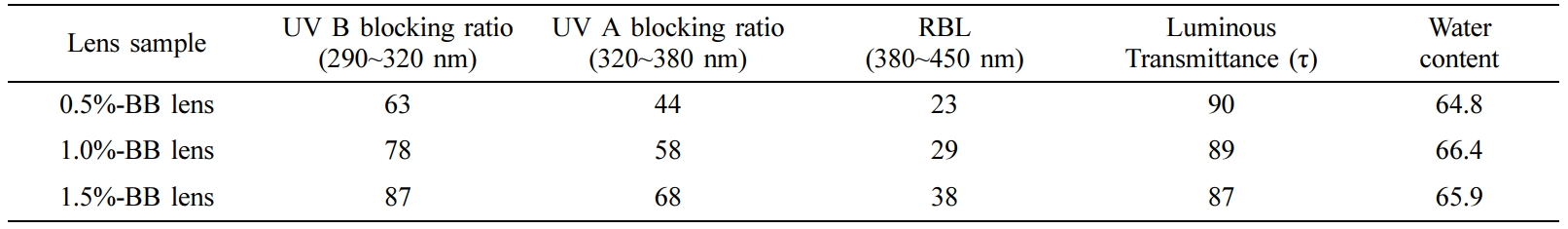 무게를 각각 측정한 후, 계산하였다. 렌즈 당 각각 3차례 측정한 값을 평균하여, 얻어진 함수율을 Table 2에 나타내었다. 측정한 결과, 3종의 BB lens들은 평균적으로