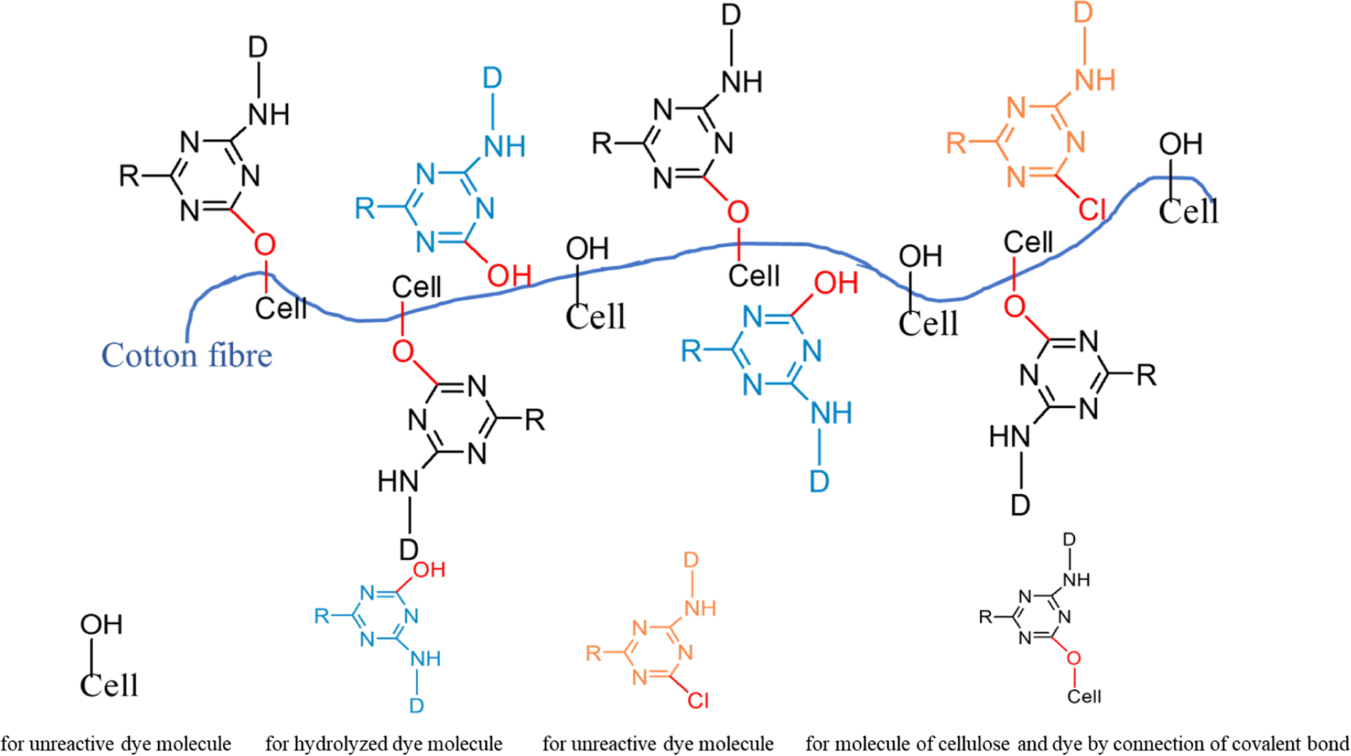 Reactive dyes are most preferred dyes for dyeing of cellulosic fibres as they can occur chemically bonded to the fibres which are being dyed,1,2 present bright and brilliant colour in various shade ranges and also inexpensive to apply.3-5 Under alkaline conditions, reactive dyes react with hydroxyl groups of cellulose, mostly by nucleophilic substitution or addition, to form the covalent bonds.6-8 However, the following problems exist with reactive dyed cotton fabrics: 1) Some reactive groups are hydrolyzed and inactivated during the dyeing process, resulting in a low dyeing rate.9,10 2) The chemical stability of the covalent bond formed between the dye and cellulose is poor.11 Under humid and hot conditions, it is easy to break the bond and fade, and the fixation rate is low. According to statistics, about half of the dye is lost with the drainage. The distribution of dye on the fibers is shown in Figure 1. As a result, there are a large number of unfixed dyes on the dyed fabric and the dyeing fastness is unqualified. So, it must be treated with a fixing agent.