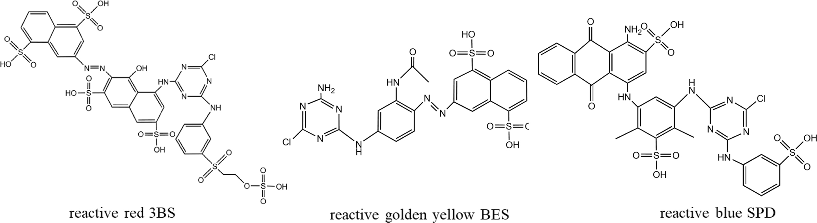 Figure 2 The chemical structure of reactive red 3BS, reactive golden yellow BES, and reactive blue SPD. |