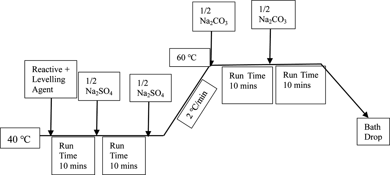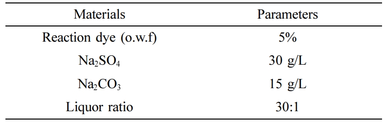 Dyeing of Cotton Fabrics. After the cotton fabric samples had been wetted in cold deionized water. Fabrics were dyed with reactive red 3BS, reactive golden yellow BES, reactive blue SPD in a laboratory dyeing machine at a liquor ratio of 30:1, respectively. The dyeing process formula was shown in Table 1. The process curve was shown in Figure 3.