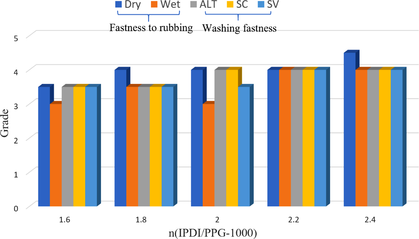Figure 4 Fastness properties of the different n (IPDI/PPG-1000). Alt: color change of dyed sample; SC: staining on cotton; SV: staining on viscose, wash-scale (1-5). |