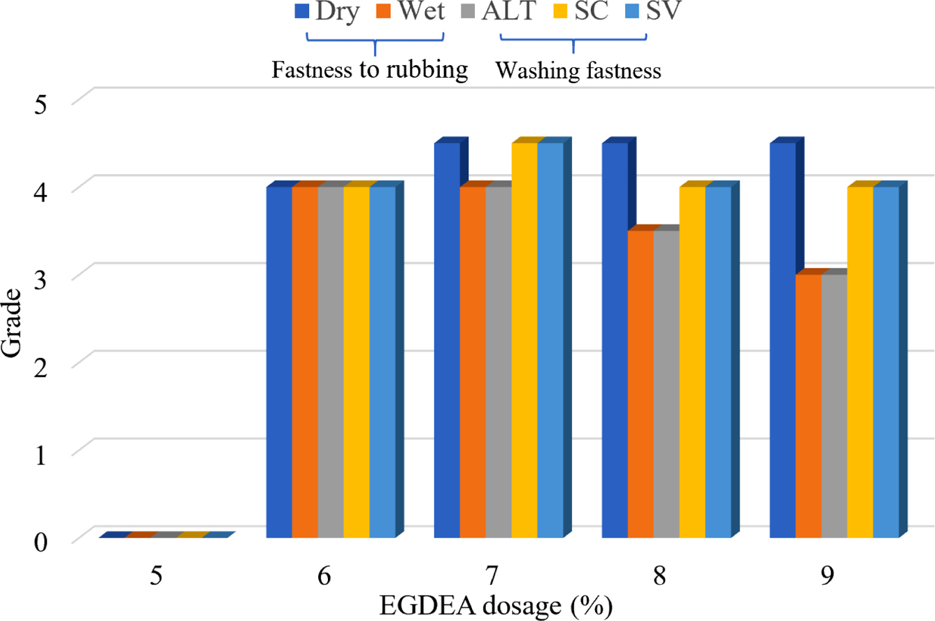 Figure 5 Fastness properties of the different EGDEA dosage (%). Alt: color change of dyed sample; SC: staining on cotton; SV: staining on viscose, wash-scale (1-5). |