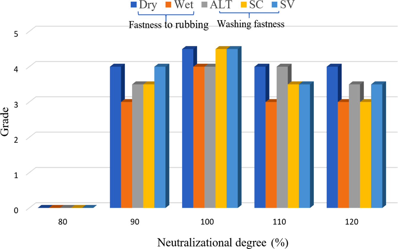 Figure 6 Fastness properties of the different neutralizational degree (%). Alt: color change of dyed sample; SC: staining on cotton; SV: staining on viscose, wash-scale (1-5). |