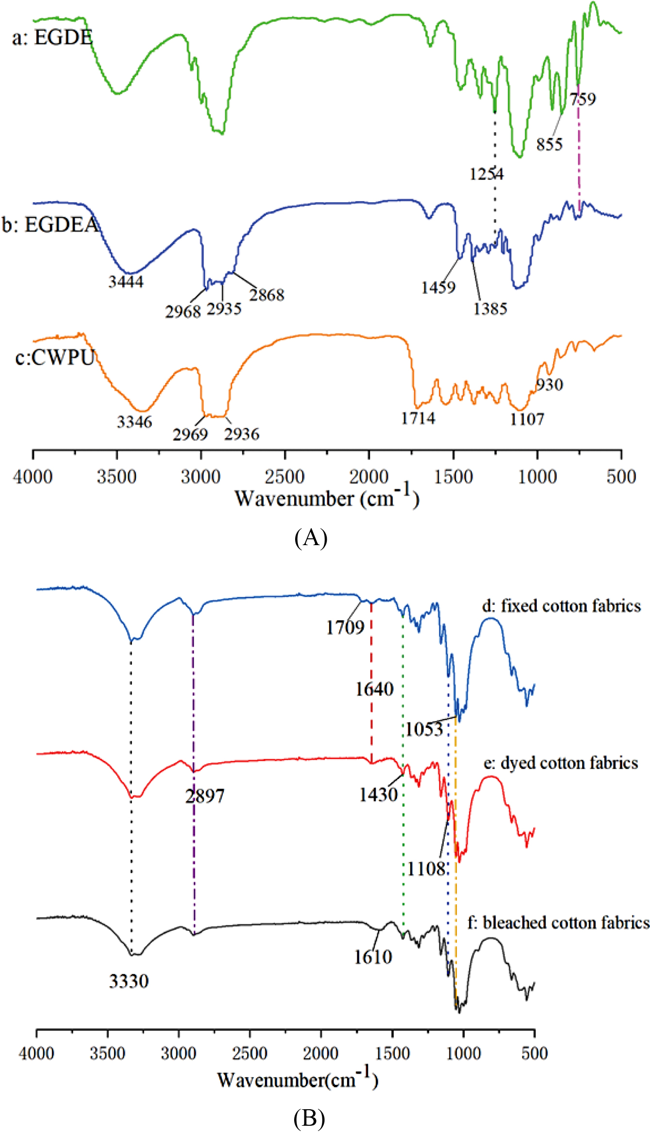 Characterization. The FTIR spectra were used to detect the chemical structures of EGDE, EGDEA and CWPU. Measurements were recorded on a Nicolet 5700 FTIR spectrometer with KBr pellet method. The ATR-FTIR spectra of bleached cotton fabrics, dyed fabrics and fixed-color fabrics samples were performed between 4000 and 500 cm-1 on a Nicolet 8700 FTIR spectrometer. The resolution for all the infrared spectra was 4cm-1 and there were 32 scans for each spectrum.