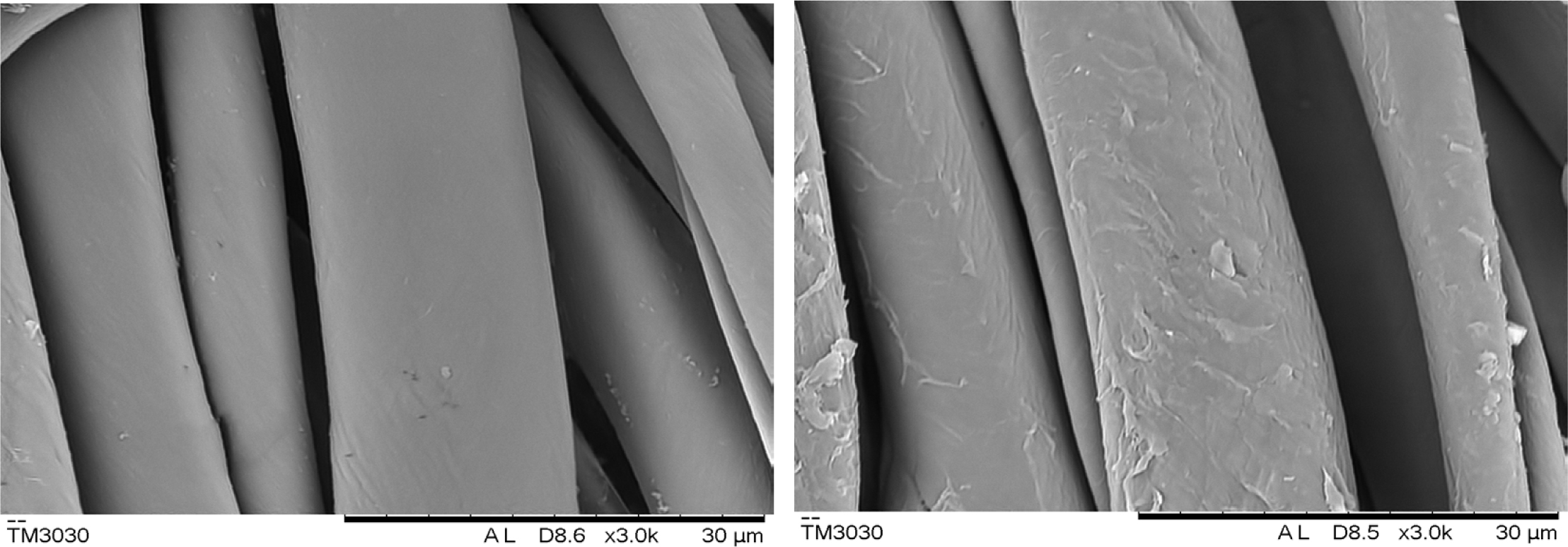 Figure 9 SEM image of cotton fibers before and after fixing. |