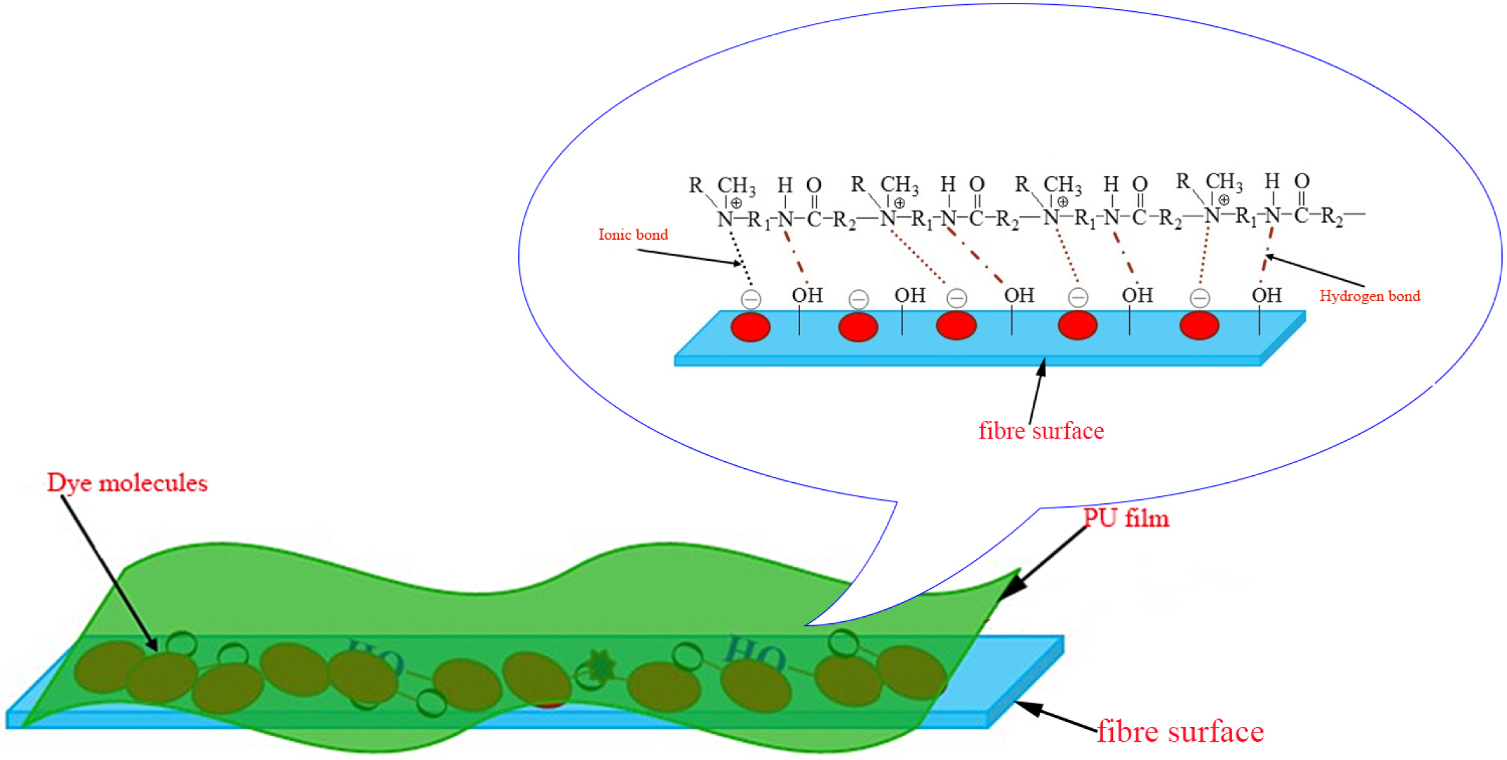 As we can be seen from Table 7, the dry rubbing fastness of fabrics treated with CWPU can be improved by 0 to 0.5 grade, the wet rubbing fastness can be improved by 0.5 to 1 grade, and the fade and staining can be improved by 0.5 to 1 grade. The fixing effect of the fixing agent Y on wet rubbing fastness is better than CWPU, but the advantage of CWPU is that it does not contain formaldehyde. Comparing the K/S value of the fabric after fixing, it can be seen that the fabric treated with CWPU fixing color is darker and the dyeing effect is better. The excellent color fixing performance of CWPU can be attributed to the following three reasons (the illustration was shown in Figure 10).