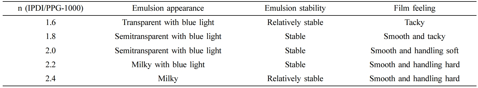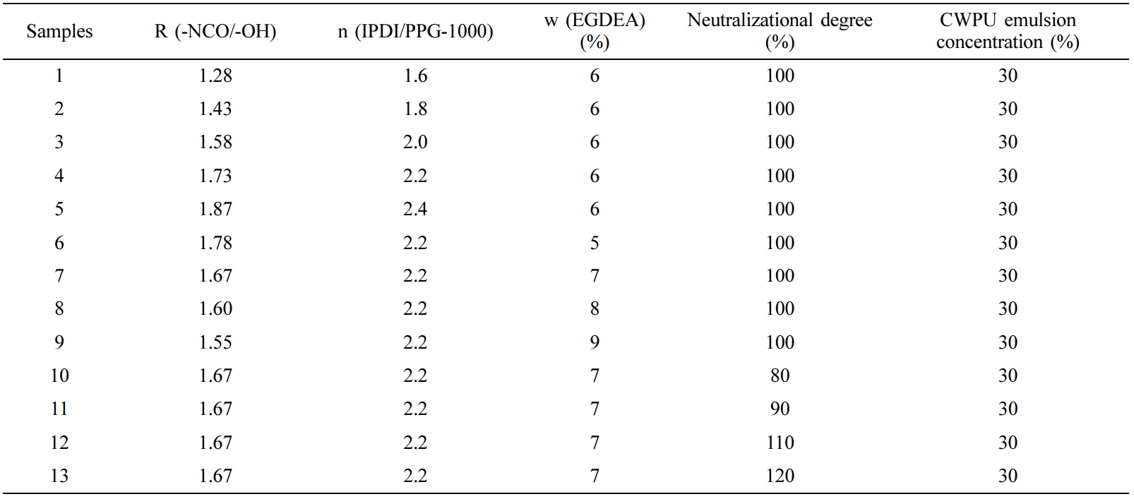 The Optimization of Synthesis Process for CWPU. The performance of CWPU emulsions was studied with different n (IPDI/PPG-1000) (molar ratio), EGDEA dosage (the percentage of the total mass of the monomers) and neutralizational degree (the neutralizational degree refers to the ratio of the amount of acid added to the amount of acid required to completely neutralize the amino group on the polymer when -NR2 on the polymer chain is neutralized with an acid). The compositions of CWPU prepared in this paper with different n (IPDI/PPG-1000), EGDEA dosage and neutralizational degree are shown in Table 2.