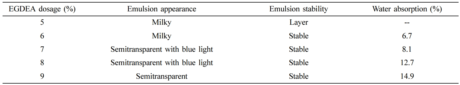 The experimental data are shown in Table 4 and Figure 5. It was observed that under the same condition of others, as the EGDEA content increases, the appearance of the emulsion changes from milky white to transparent. This indicated that the particle size of the emulsion is gradually diminished and the stability of the emulsion is also improved. In the meantime, as the content of EGDEA increases, the water resistance of the adhesive film decreases. It may be explained by the fact that the hydrophilicity of CWPU is enhanced, the polymer molecular chains are not easily entangled with each other and the crosslink density between the molecules is reduced. This process ultimately resulted in that water molecules enter the adhesive film more easily, thus the water resistance of the film is reduced.29 But, the fastness level of the color fixing effect increased initially, then decreased as EGDEA concentration increased, meaning that the appropriate cationic group can react with the dye anionic group to improve the adhesion fastness of the reactive dye on the fabric. After that, the auxiliary molecules which has been absorbed will have a large repulsive force on the continuously diffused auxiliary molecules, and affect the color fixing effect. Based on the above analysis, considering emulsion stability, film-forming property, and fastness level comprehensively, it is more appropriate to choose EGDEA dosage at 7%.