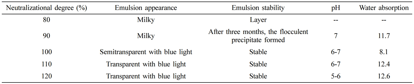 The experimental data are shown in Table 5. As the neutralizational degree increased from 80% to 120%, emulsion appearance changed from milky white to transparent pan-blue light. It can be explained by the fact that with the increases of the concentration of the quaternary ammonium cation group, the ion density on the surface of the latex particles gradually increases, and the hydrophilicity of the polyurethane prepolymer gradually increases, which improves the emulsification effect of the polymer prepolymer with water. The result is that the dispersion of the emulsion becomes more uniform and more stable and the appearance of the emulsion gradually transparent. When the neutralizational degree is low, there are fewer active centers on the polymer molecular chain, so the hydrophilicity of polyurethane prepolymer cannot be fully expressed. And when polyurethane prepolymer is dispersed in water to form larger latex particles, the denseness of the formed rubber film is poor, so the water resistance is poor. With the increases of the neutralizational degree, the concentration of the quaternary ammonium cation center on the polymer chain becomes larger, and the hydrophilicity of polyurethane prepolymer also enhances.30,31 The polyurethane prepolymer is easier to disperse in water, and the emulsion particle size is smaller. So that the adhesive film is formed with enhanced water resistance. When the neutralizational degree is larger than 100%, the content of hydrophilic group in the molecular chain will no longer change, the particle size of the emulsion will no longer change, and the excess glacial acetic acid will become an impurity in the reaction system. The water resistance will decrease as the neutralizational degree increases. As depicted in Figure 6, the point with the best fastness was known when the neutralizational degree is 100%. This is attributed to the large particle size of polyurethane emulsion when neutralizational degree is less than 100%. This leads to poor film formation of polyurethane on the fiber. When the neutralizational degree exceeds 100%, the fixing agent solution has a lower pH than the neutralizational degree of 100%, and the number of dye molecules forming covalent bonding with the fiber is reduced. Taken together, the neutralizational degree is 100%.