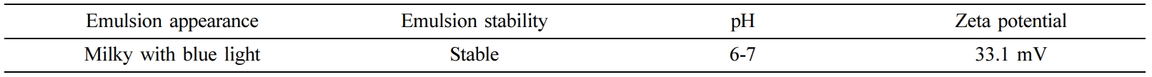 As can be seen from Table 6 and Figure 8, the average particle size of the emulsion particles is 125 nm, and the emulsion particle size distribution is narrow. This shows that the particle size is relatively uniform. The average Zeta potential of the emulsion was 33.1 mV, and its absolute value was greater than 30 mV. It has a higher positive charge, and the electrostatic repulsion between the emulsions can keep the emulsion particles in the system stable, and the emulsion stability is better.