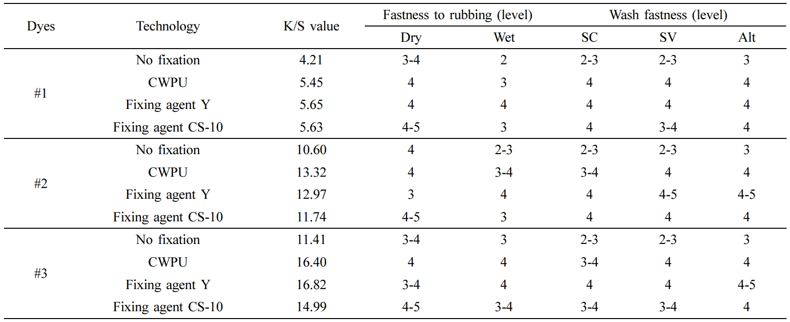 Comparisons of Fixing Effect. The CWPU fixing agent was synthesized by the above optimum process conditions. It is applied to the cotton fabrics dyed with reactive dyes. The CWPU treated fabric was compared with the unfixed fabric, and the fabric treated with fixing agent Y or cationic fixing agent (copolymer of dimethyldiallylammonium chloride and diallylamine), and the results are shown in Table 7.