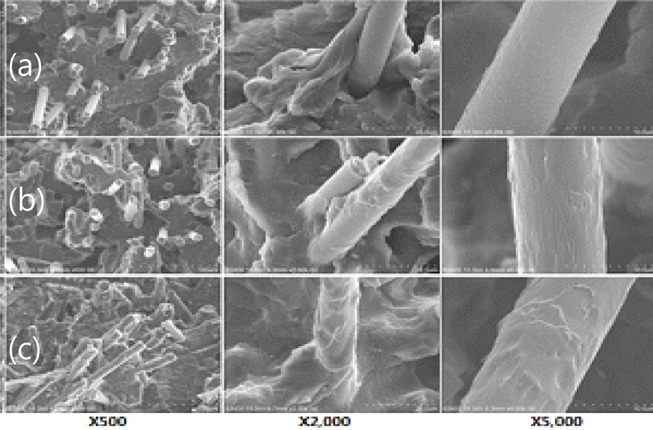 모폴로지. Figure 1은 PA66(저점도)수지에 (a) 아연화물 무첨가 유리섬유(PA66(L0); 위열), (b) 아연화물 저농도 첨가한 유리섬유(PA66(L1); 중간열), (c) 최적아연화물 첨가한 유리섬유(PA66(L3); 바닥열) 간의 계면접착의 상태를 SEM으로 관찰한 사진이다. Figure 1(a)는 유리섬유의 표면이 매끄러운 것이 관찰된다. 그리고 아연화물을 첨가한 유리섬유(중간열(1(b)) 혹은 바닥열(1(c)) 사진)에 비해서 계면에 공극(interfacial gap)이 존재하며 PA66수지로부터 뽑힘(pull-out)현상이 더 많이 관찰된다. Figure 1(b)는(중간열 사진) 아연화물이 0.1wt% 첨가된 유리섬유의 표면을 보여준다. 첨가하지 않은 유리섬유(위열)와 비교 시 표면이 거칠고 수지와 유리섬유간의 계면접착상태가 처리하지 않은 유리섬유보다 우수하다. 그리고 공극이 존재하지 않으며 뽑힘현상도 덜 관측된다. Figure 1(c) (바닥열 사진)는 아연화물이 0.3wt% 첨가된 유리섬유의 표면을 보여준다. 유리섬유 표면이 더 거칠고, 공극이 존재 하지 않으며 뽑힘현상도 덜 관측되고 계면접착이 제일 우수함이 관찰되었다.