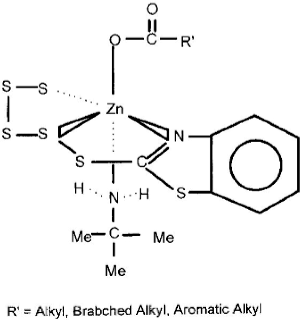 아연은 전이원소로서 촉진제 내의 활성원소(active element)와 화합물을 형성한다.18 즉, 아연이온의 ‘d’ 궤도(orbital)로 인하여 황, 질소, 산소 기증자(donor) 원소들과 함께 안정된 2가 화합물(divalent complex)을 이룬다.19 Figure 2는 아연이온이 산소나 질소와 같은 기증자 원소들과 가류 전구중간체 전단계(pre intermediate state)를 이루는 것을 보여준다.20