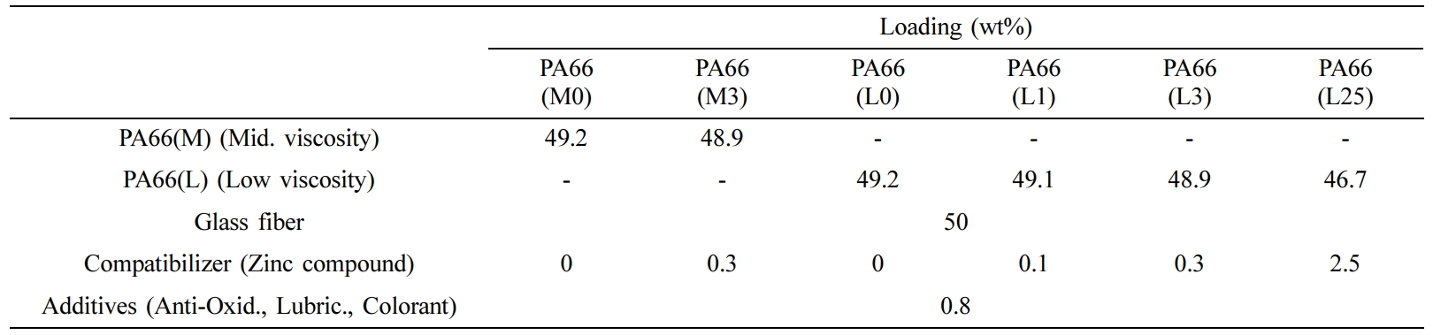 재료. 폴리아마이드66 수지는 로디아(Rhodia, 프랑스) 사, Stabamid 저점도(PA66(L))(황산법 상대점도 2.4cP), 로디아 사(프랑스), Stabamid 중점도(PA66(M))(황산법 상대점도 2.7cP), 유리섬유는 오웬스 코닝 사(Owens corning Co., 미국), 평균 입경 10 마이크론, 섬유 길이 4mm, 상용화제는 아연화물{zinc complex [(saturated, unsaturated) zinc soap, (saturated, unsaturated) fatty acid zinc, zinc oxide, zinc stearate, zinc borate, zinc laurate, zinc tartrate, zinc oleate, zinc sulfate, or a complex]}, 첨가제(산화방지제, 활제, 염료) 등이 사용되었다.