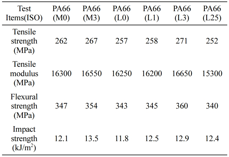 PA66 (L3) 소재임을 보여주었고, 제일 높은 인장강도값인 271MPa를 보여주었다. 농도에 따른 각 소재의 물성변화를 Table 2에 요약하였다.