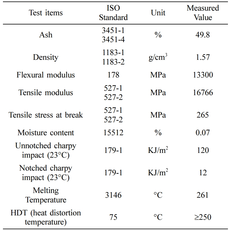시편제조. 압출기로부터 만들어진 펠렛 소재는 사출 전에 90oC에서 4시간 열풍건조 과정을 통해 소재 내의 수분 함량이 0.05% 이하가 되도록 건조하였다. 건조된 소재는 ISO 시험시편 제작을 위해 최대 사출압이 1920kg/cm2인 Ø30 injection molding machine(우진프라임, 대한민국)을 사용하였다.