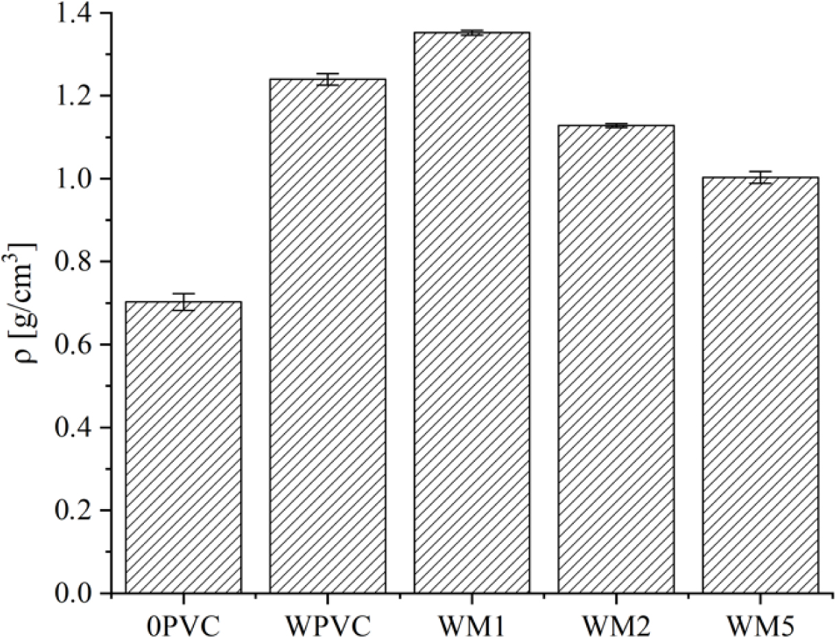 Experimental Approach. Based on Archimedes’ principle, density measurements were carried out with an analytical balance. The dry and in water immersed masses were measured to calculate the density. The results of 3 samples per type were averaged.