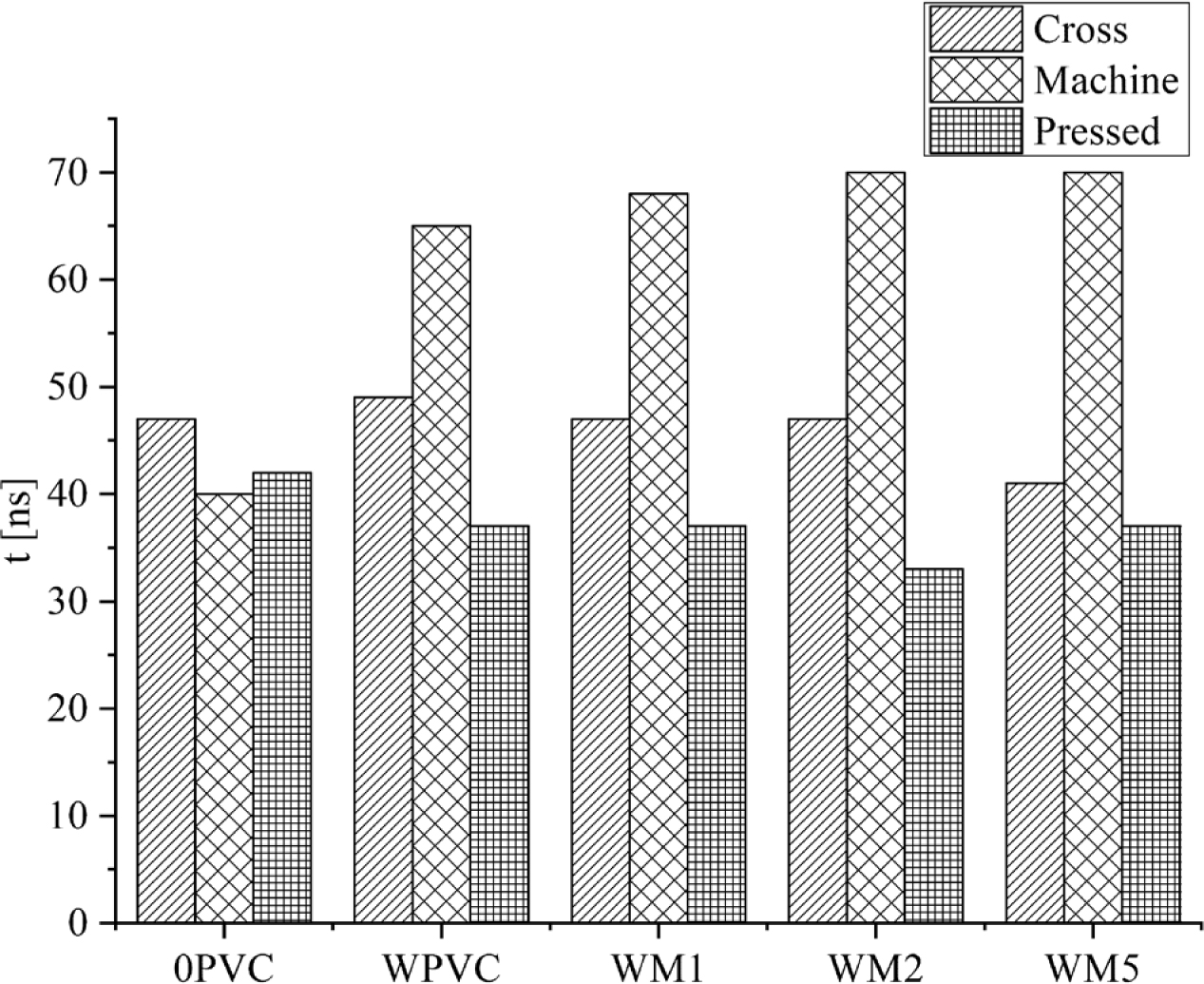 The ultrasonic wave propagates faster in the wood than in air, and thus theoretically the moduli of the samples will also be higher than that of the 0PVC sample. The calculated moduli of the samples are shown in Figure 6. The reason for this higher moduli in the samples is that the density of the foams has increased with the addition of wood flour that increasing the materials amount. The beech wood we used had a substantially lower modulus than the base PVC, and therefore the propagation speed and modulus decreased. The increase in modulus shows a stronger connection between the filler and the matrix and the orientation of the extruded samples. Based on the results of calculated the moduli, the orientation of the reinforcing materials can be determined. The calculated moduli of wood filled foams are lower in the machine direction than the moduli for the other composites. In fact, the modulus of the pressed samples is also higher due to the density of the samples. In the case of pressed specimens, the orientation effects may be negligible.