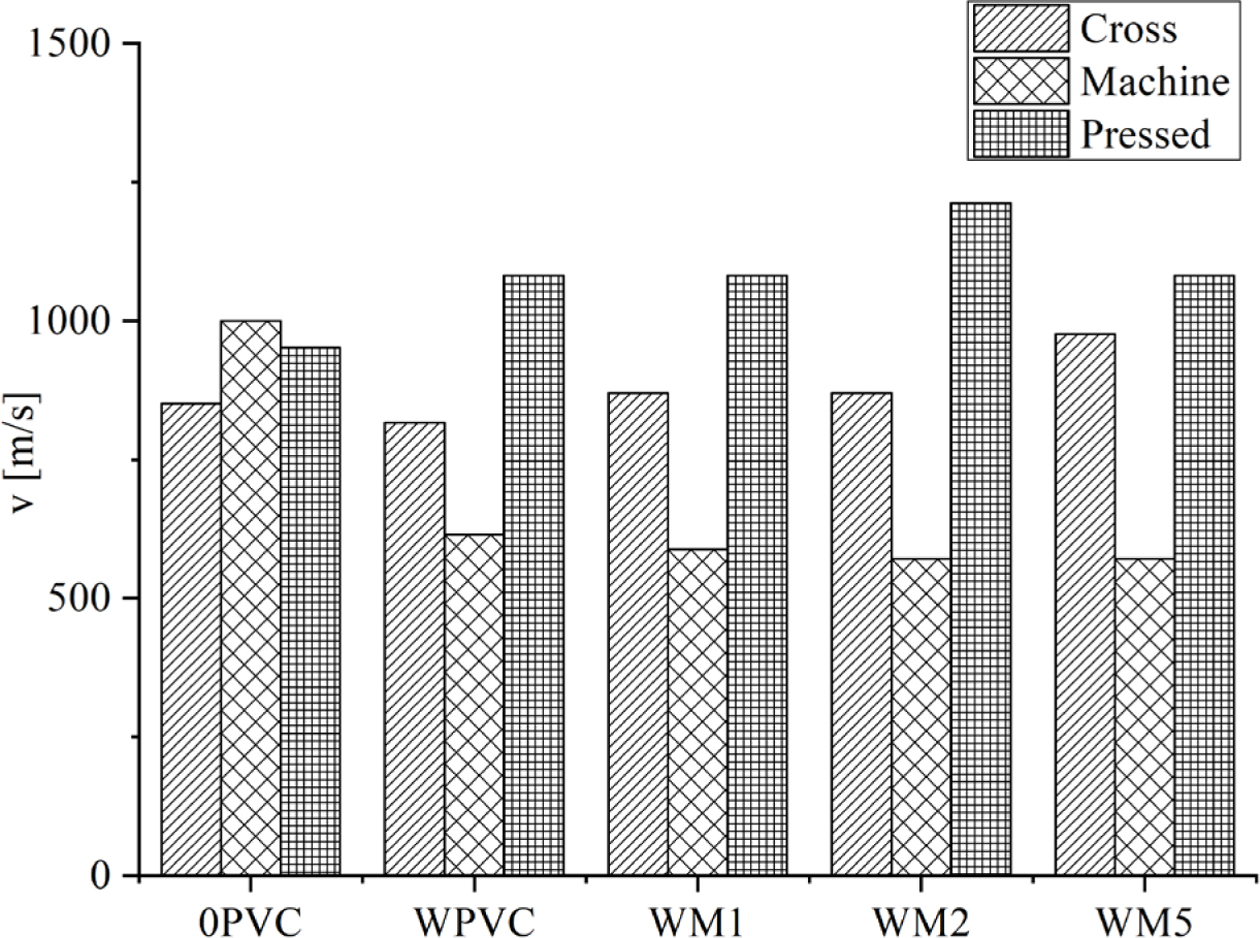 From the results of the calculated ultrasonic propagation speeds of the pressed samples, the speed in the wood composites was higher than in the 0PVC sample. In the case of the foamed composites, the sample without filler had a faster propagation speed in the machine direction. Based on Figure 5, the propagation of the ultrasound in the machine direction indicates that the longitudinal sound waves actually take a longer path between the cells when compared to the cross direction. The ultrasound propagation time gets faster as the amount of MDI is increased in the cross direction. This anisotropic behavior is only observed in the natural additive filled composites.