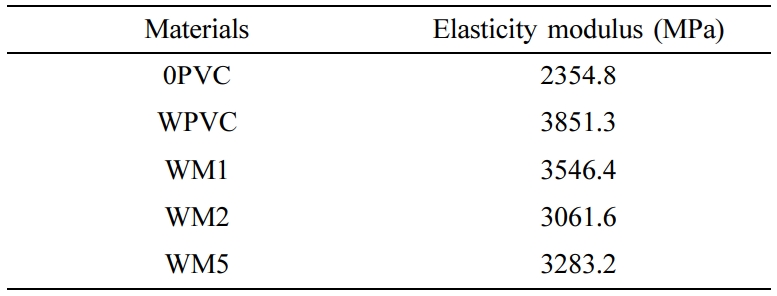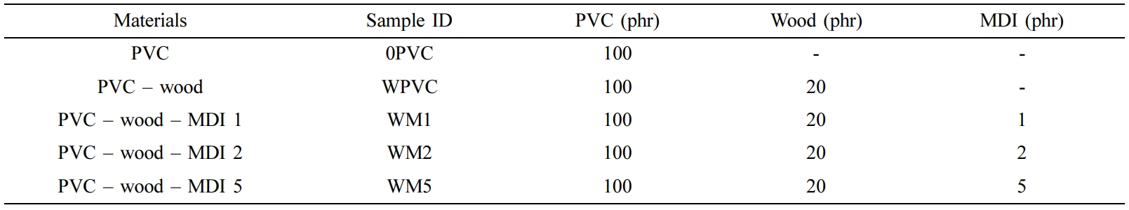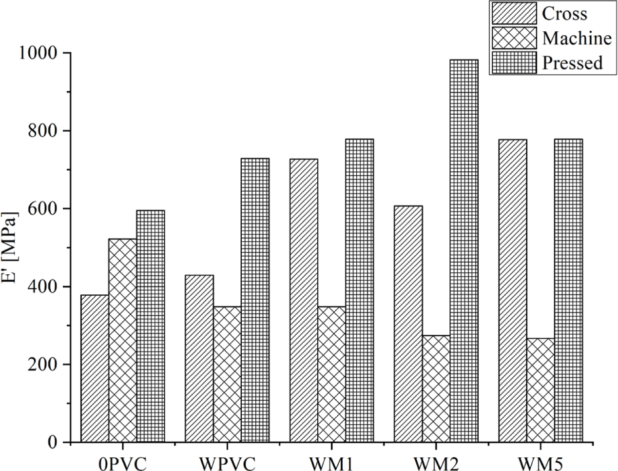 The 0PVC sample measurement had the lowest modulus. The content of the wood increased the modulus for all the wood composites.27 Compared to the WPVC sample, the modulus of the MDI containing composites decreased; this also shows the structure-modifying effect of MDI.