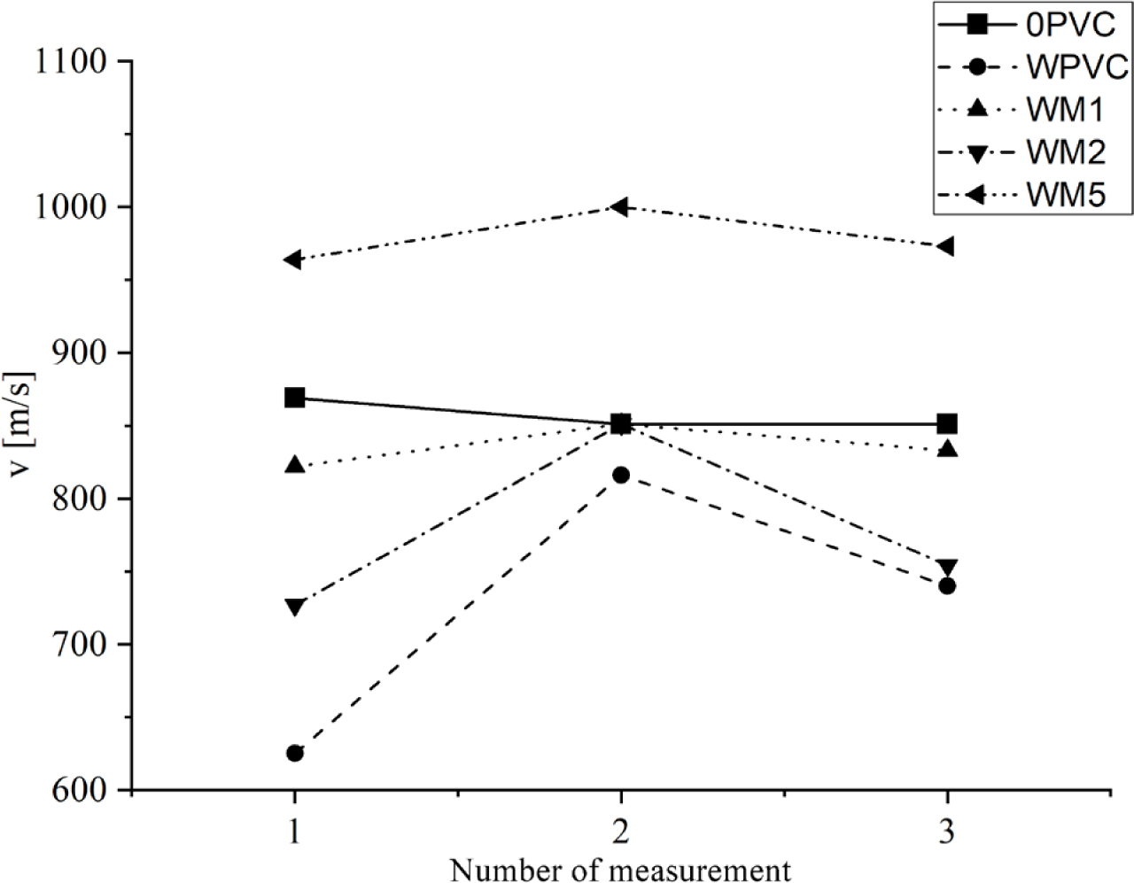 To interpret the measurement results, measurements of unfilled PVC and neat beech wood were also performed. The results of the unfilled PVC sample showed an isotropic distribution in any direction. In the case of beech wood, the propagation speed was lower in the fiber than in the cross direction. As a result, the beech wood has a lower modulus and ultrasonic propagation speed than the PVC. Depending on the propagation rate, the modulus of the PVC was higher (595MPa) than the modulus of the wood (cross – 306MPa, fiber – 148MPa). Therefore, the propagation rate slows down when an ultrasonic wave reaches the wood particle. This also explains the results of the ultrasonic measurements presented above.