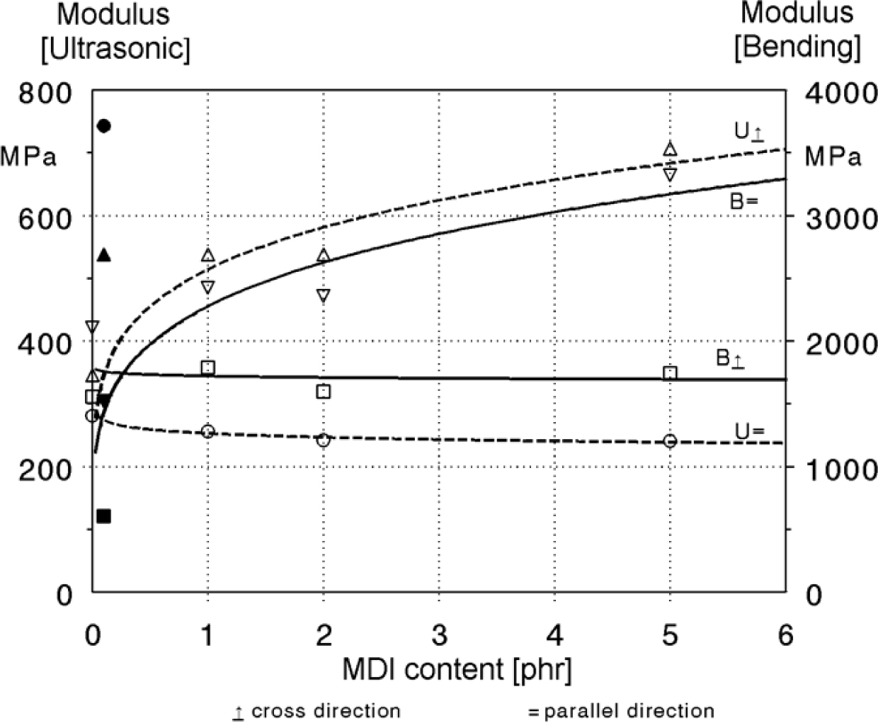 Figure 8 Comparison of ultrasonic and flexural moduli mdi content. |