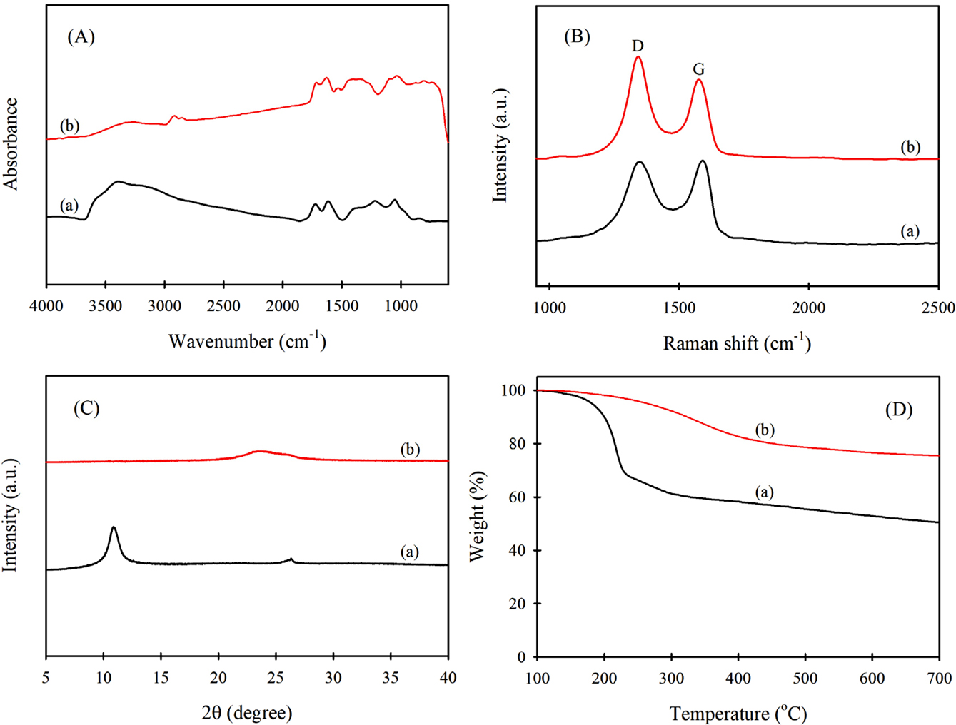 Figure 1 (A) FTIR spectra; (B) Raman spectra; (C) X-ray diffraction patterns; (D) TGA curves of (a) GO; (b) GO-g(6.4%)-PCL. |