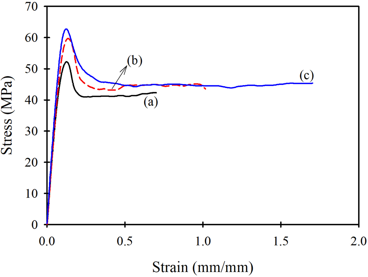 Figure 2 Tensile stress-strain curves of PVC composite s-films: (a) neat PVC; (b) PVC/0.3 wt% GO; (c) PVC/0.3 wt% GO-g(6.4%)- PCL. |