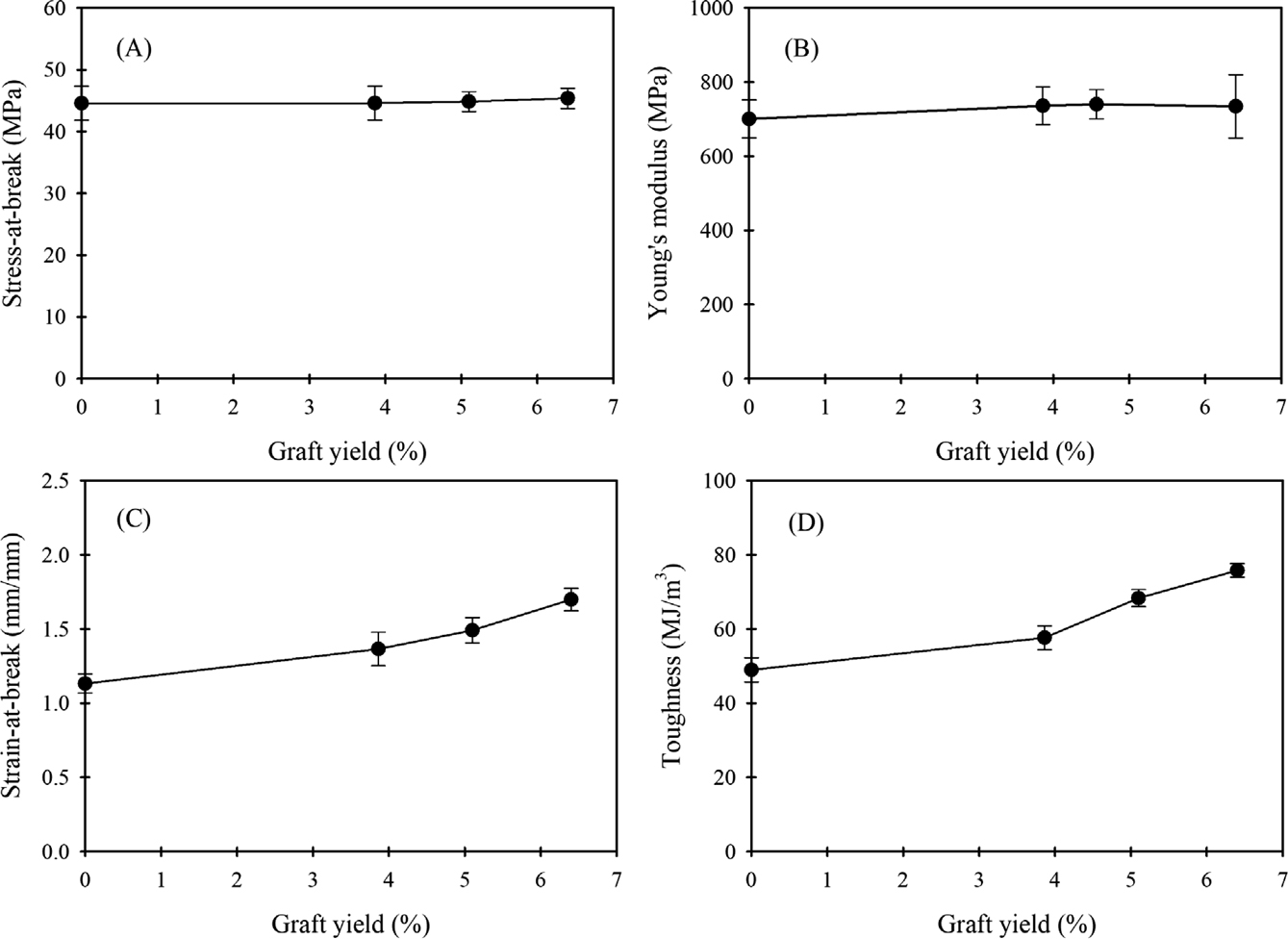 Figure 3 Changes in tensile properties of PVC/0.3 wt% GO-g-PCL composite s-films according to the graft yield of GO-g-PCL: (A) stress-at-break; (B) Young’s modulus; (C) strain-at-break; (D) toughness. |