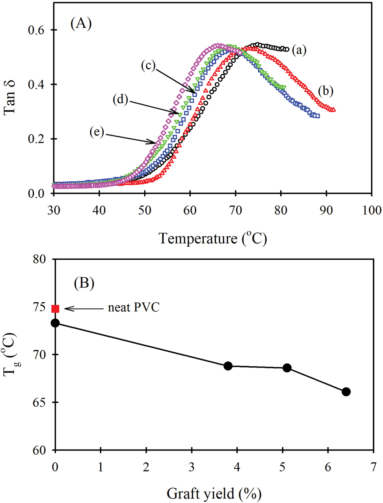 Figure 4 (A) Tanδ curves of (a) neat PVC; PVC/0.3 wt% GO-gPCL composite s-films with GO-g-PCL graft yield (%) of (b) 0(GO); (c) 3.8; (d) 5.3; (e) 6.4. (B) Change of PVC Tg in PVC/0.3 wt% GO-g-PCL composite s-film according to the graft yield of GO-g-PCL. |