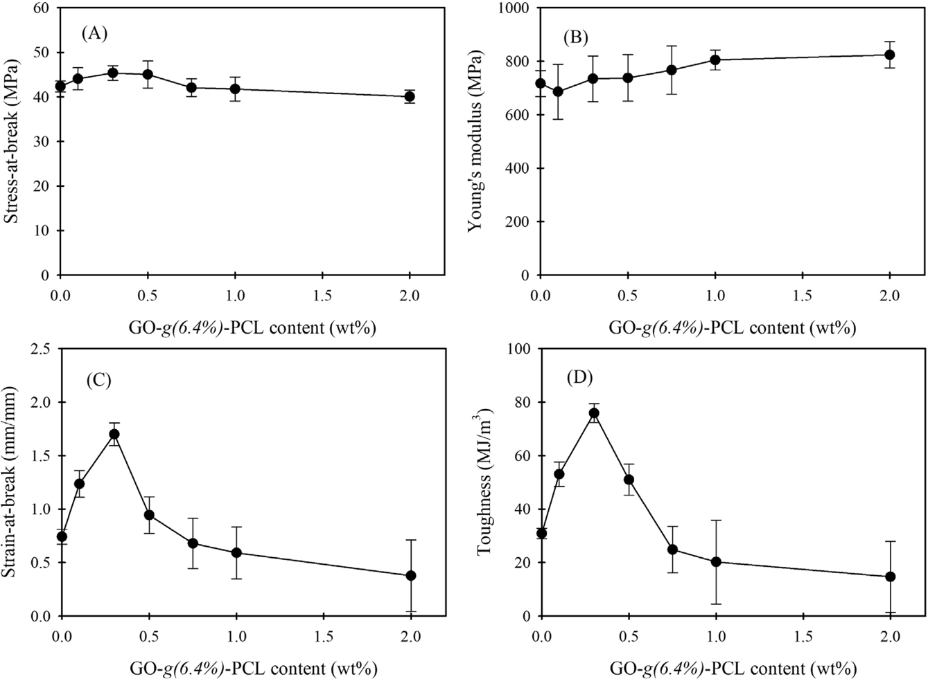 Figure 5 Changes in tensile properties of PVC/GO-g(6.4%)-PCL composite s-films according to the GO-g(6.4%)-PCL content: (A) stress-at-break; (B) Young’s modulus; (C) strain-at-break; (D) toughness. |